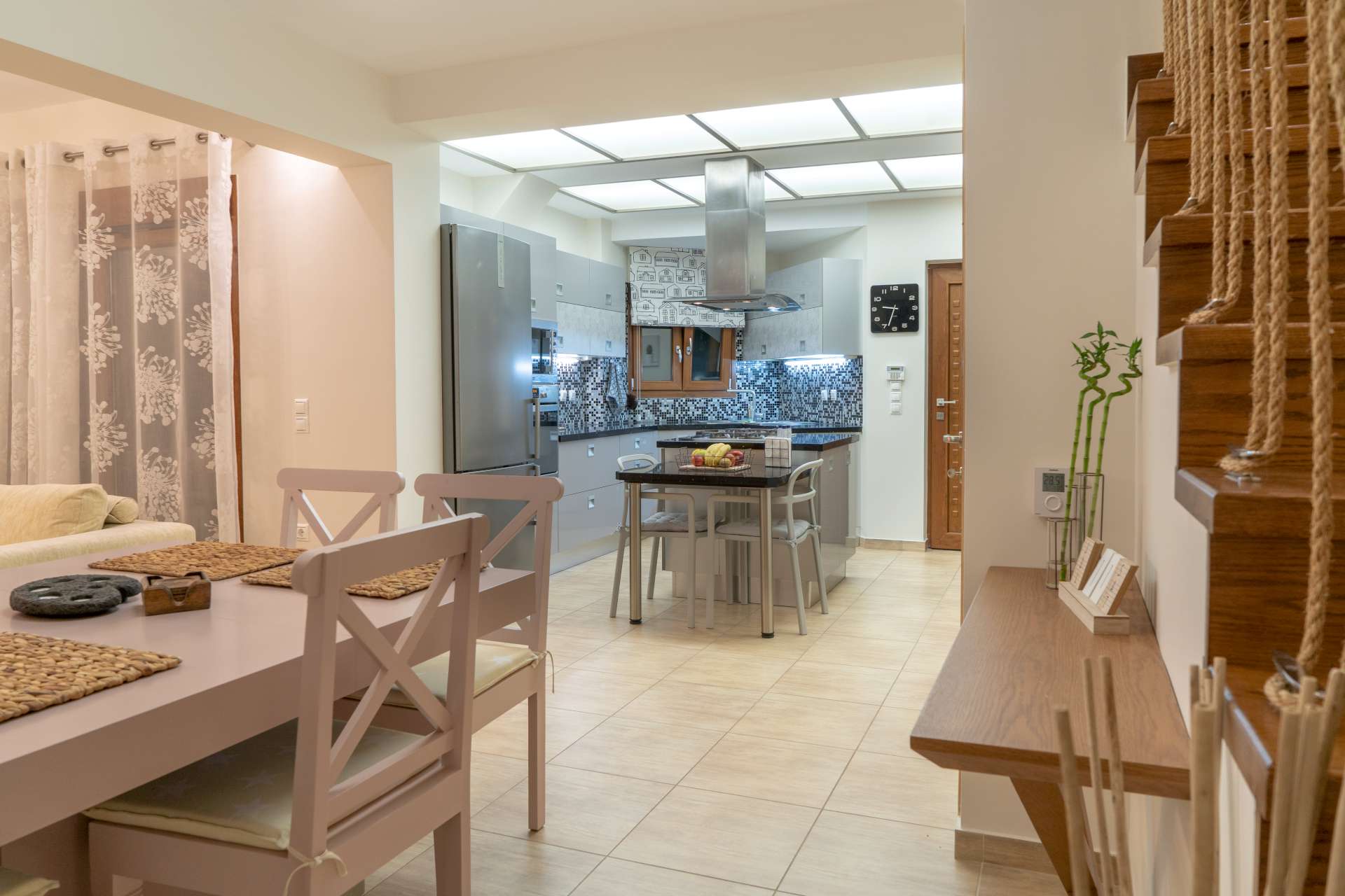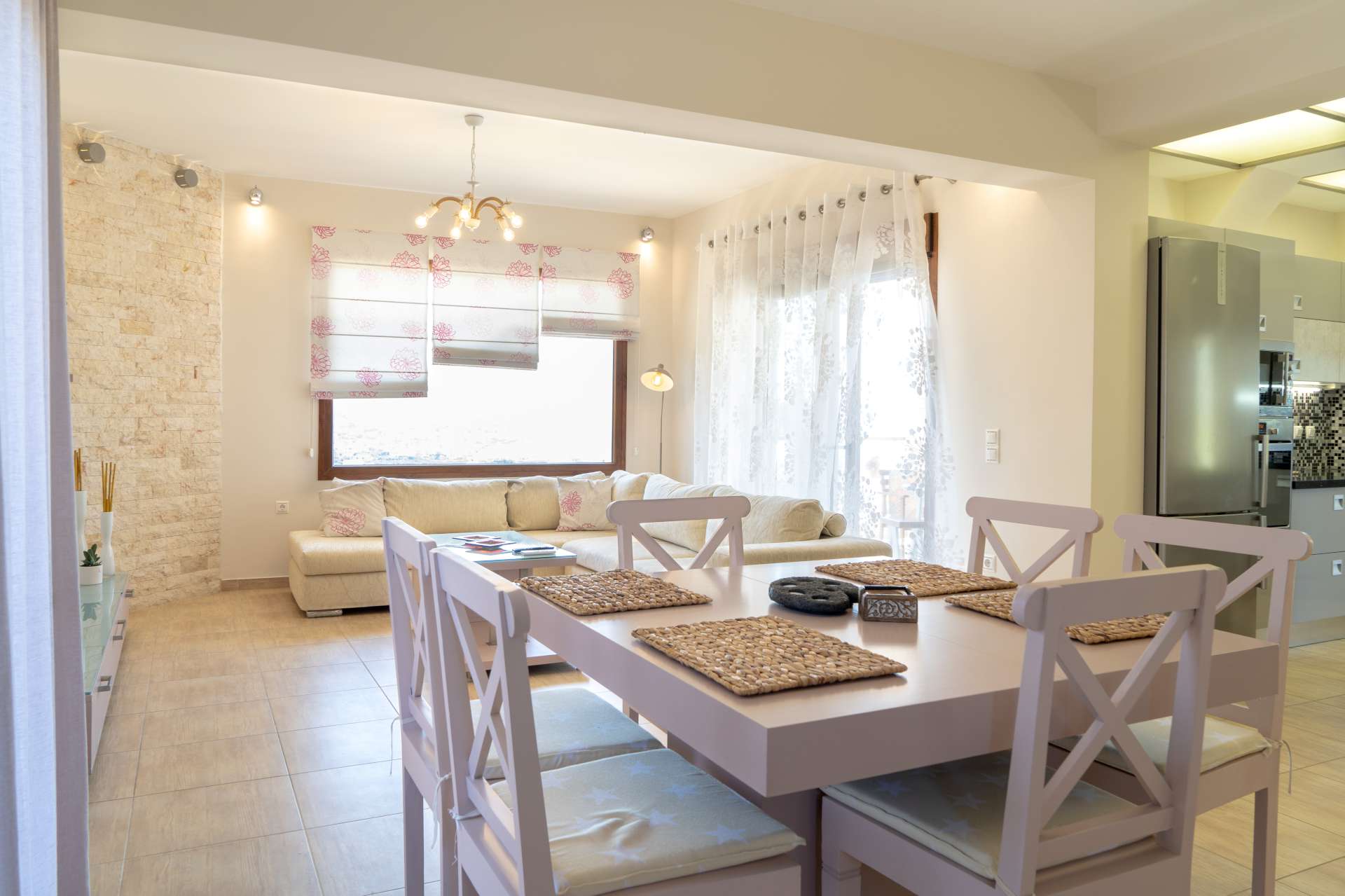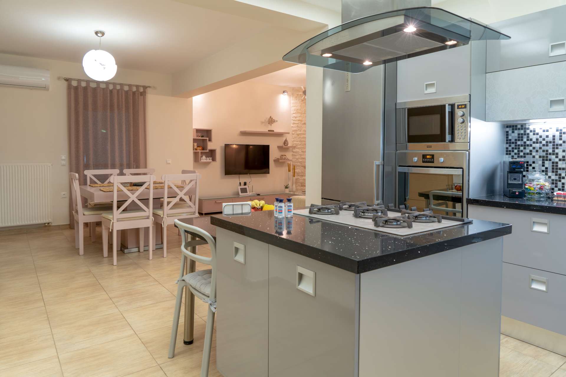 Μπαίνοντας στο εσωτερικό του σπιτιού θα συναντήσετε μια μοντέρνα και πλήρως εξοπλισμένη κουζίνα, με όλες τις σύγχρονες ανέσεις και την τραπεζαρία, ενώ προχωρώντας προς τα δεξιά υπάρχει το σαλόνι με τον αναπαυτικό καναπέ και μια επίπεδη τηλεόραση για να παρακολουθήσετε τις ταινίες στο Netflix ή ακόμα και να βγείτε στη μεγάλη βεράντα για να απολαύσετε την θέα όλου του Μακρύ Γιαλού.