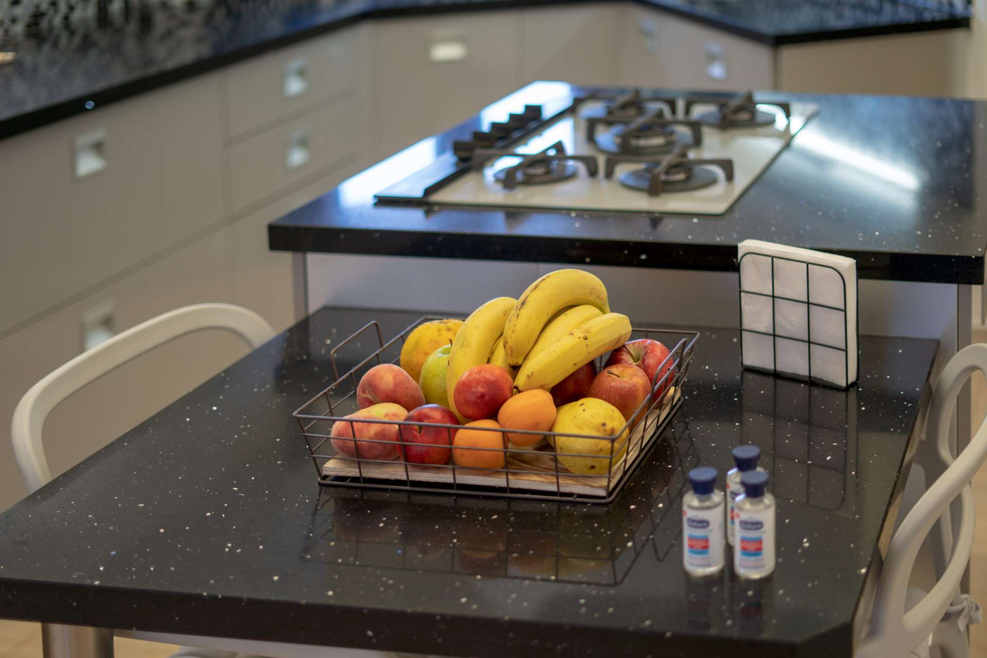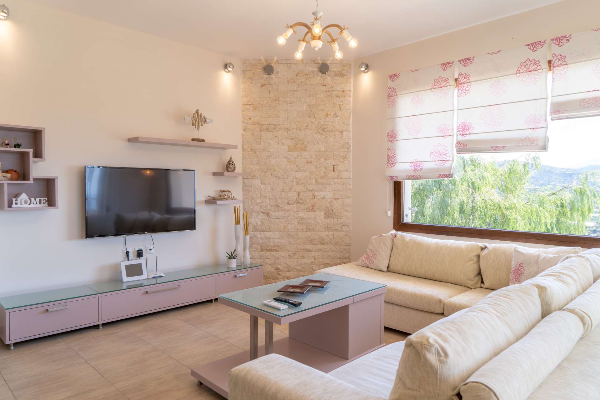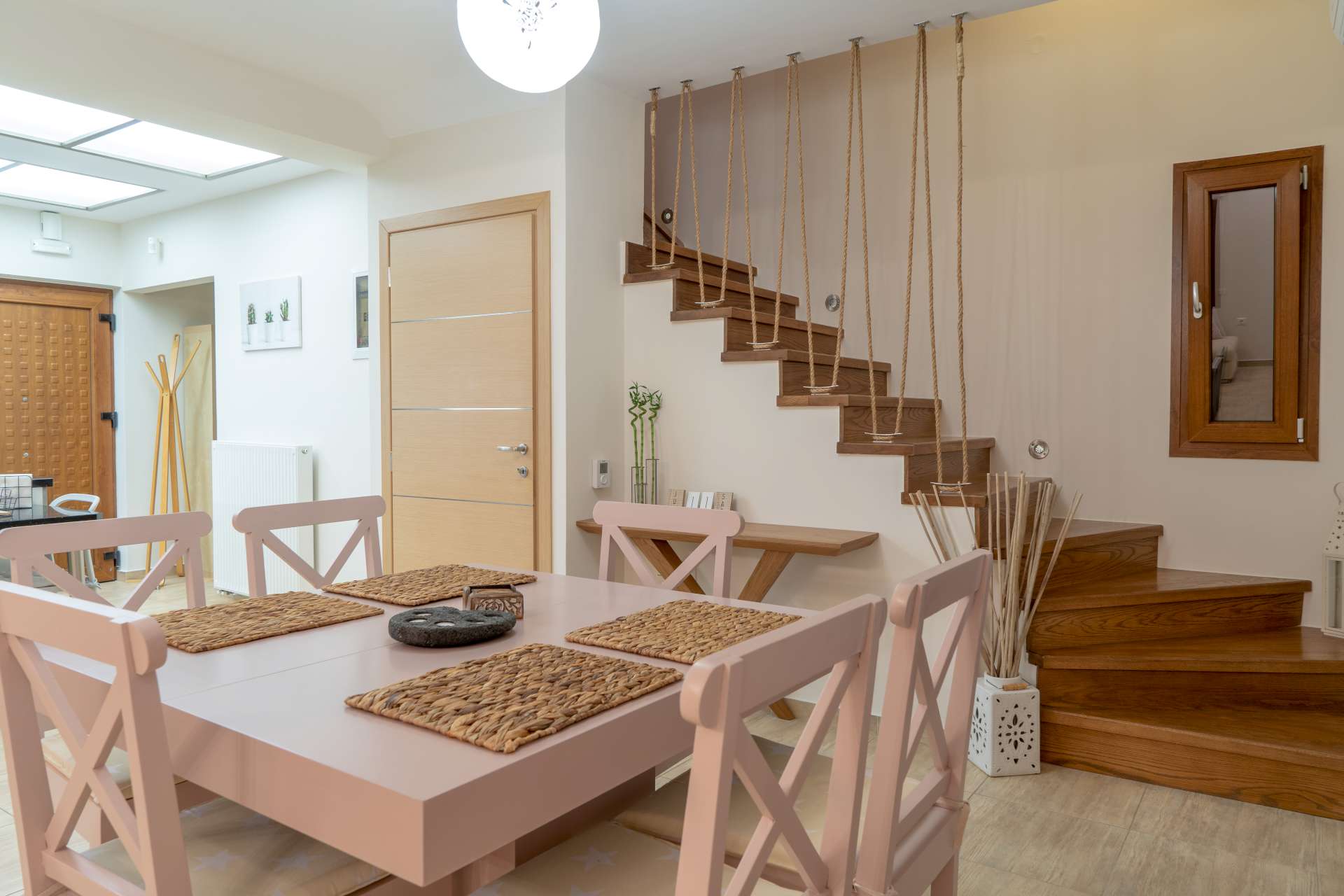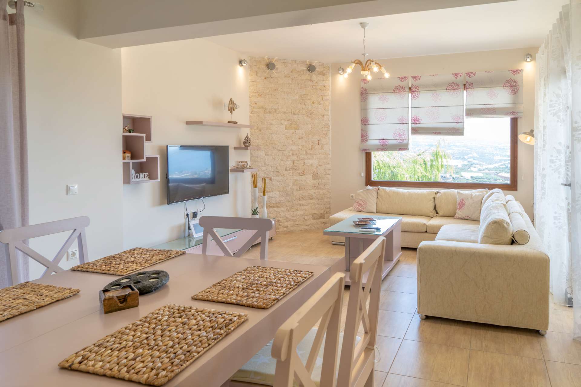 Μπαίνοντας στο εσωτερικό του σπιτιού θα συναντήσετε μια μοντέρνα και πλήρως εξοπλισμένη κουζίνα, με όλες τις σύγχρονες ανέσεις και την τραπεζαρία, ενώ προχωρώντας προς τα δεξιά υπάρχει το σαλόνι με τον αναπαυτικό καναπέ και μια επίπεδη τηλεόραση για να παρακολουθήσετε τις ταινίες στο Netflix ή ακόμα και να βγείτε στη μεγάλη βεράντα για να απολαύσετε την θέα όλου του Μακρύ Γιαλού.