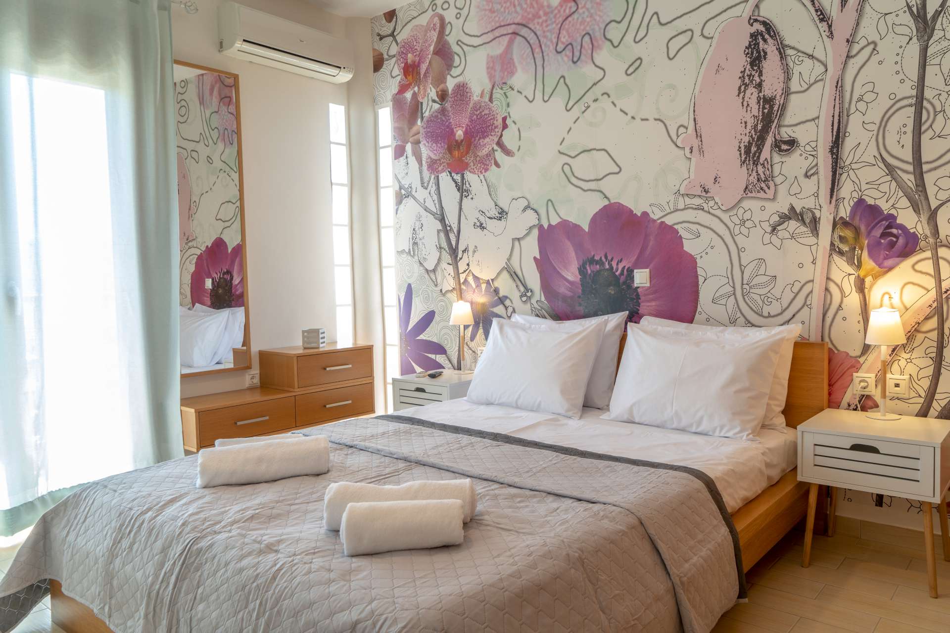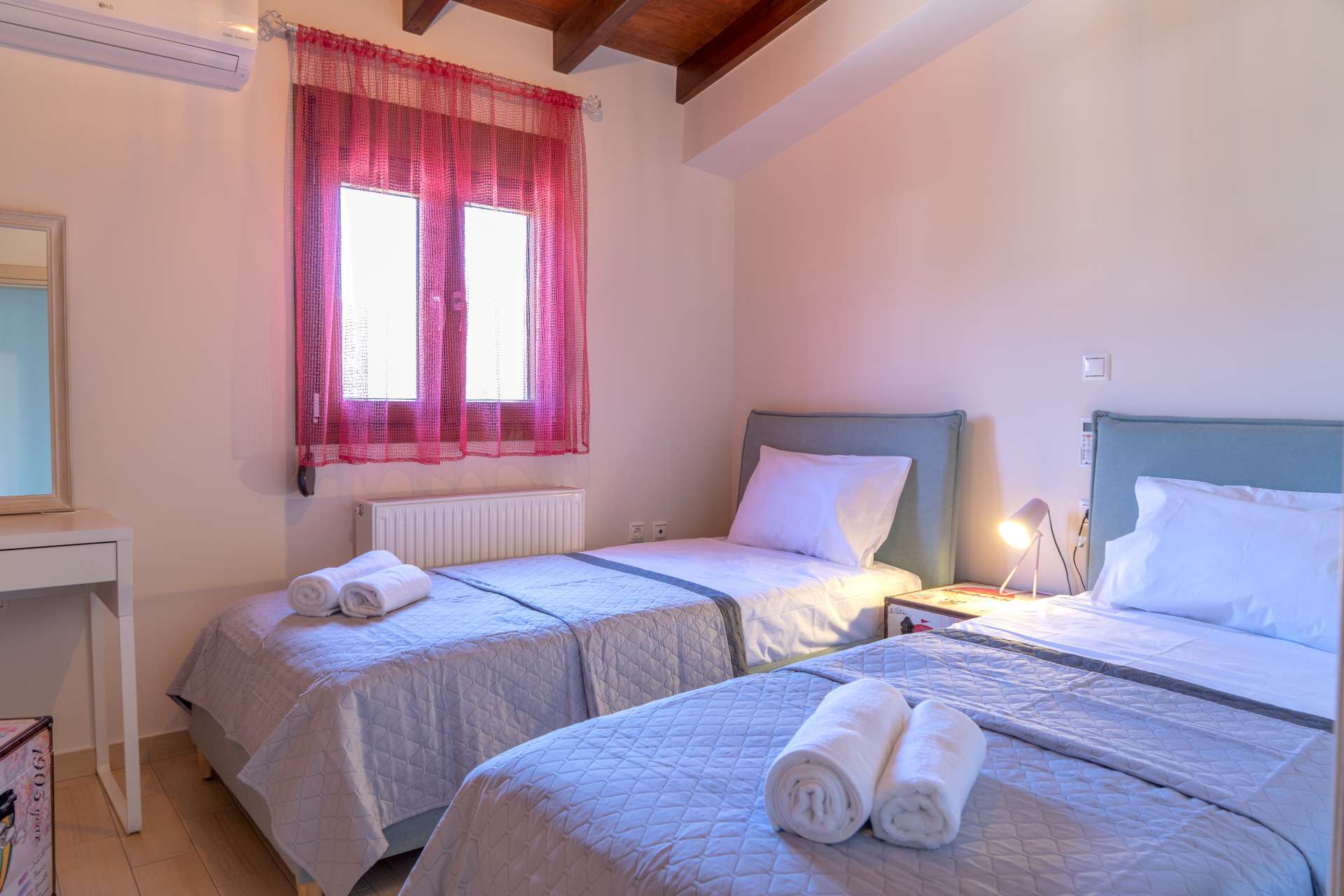 Στον επάνω όροφο της Villas βρίσκονται τα 2 υπνοδωμάτια με διπλά κρεβάτια, καθώς επίσης 1 δωμάτιο με 2 μονά κρεβάτια και 1 δωμάτιο με ένα ημίδιπλο κρεβάτι και 1 μεγάλο κοινόχρηστο μπάνιο. Όλα μας τα δωμάτια είναι εξοπλισμένα με air condition, τηλεόραση και κεντρική θέρμανση .